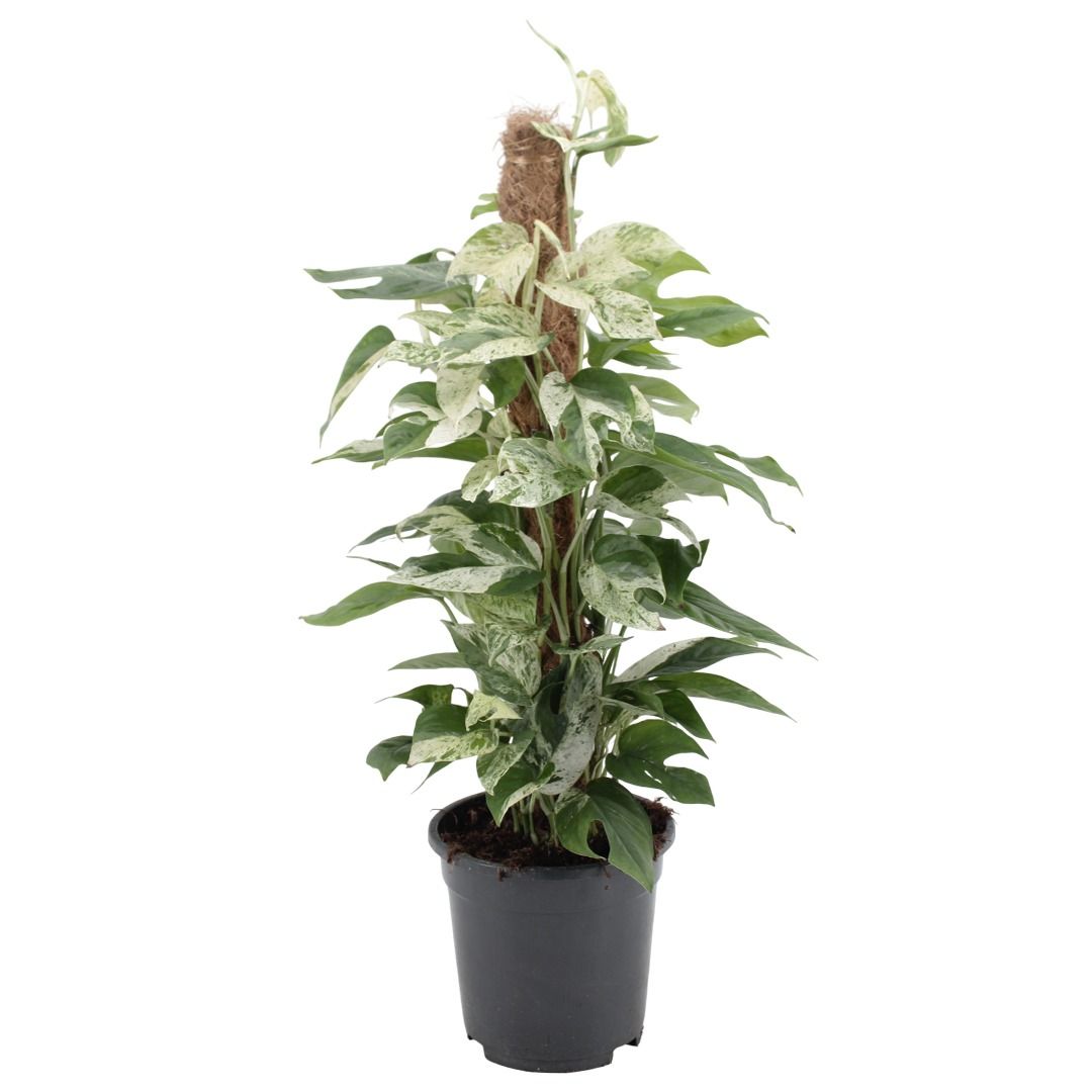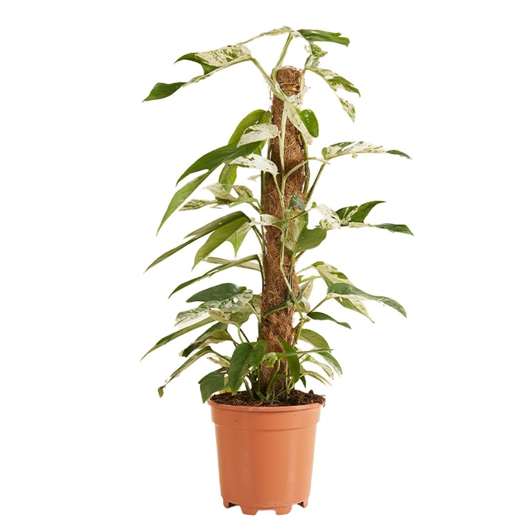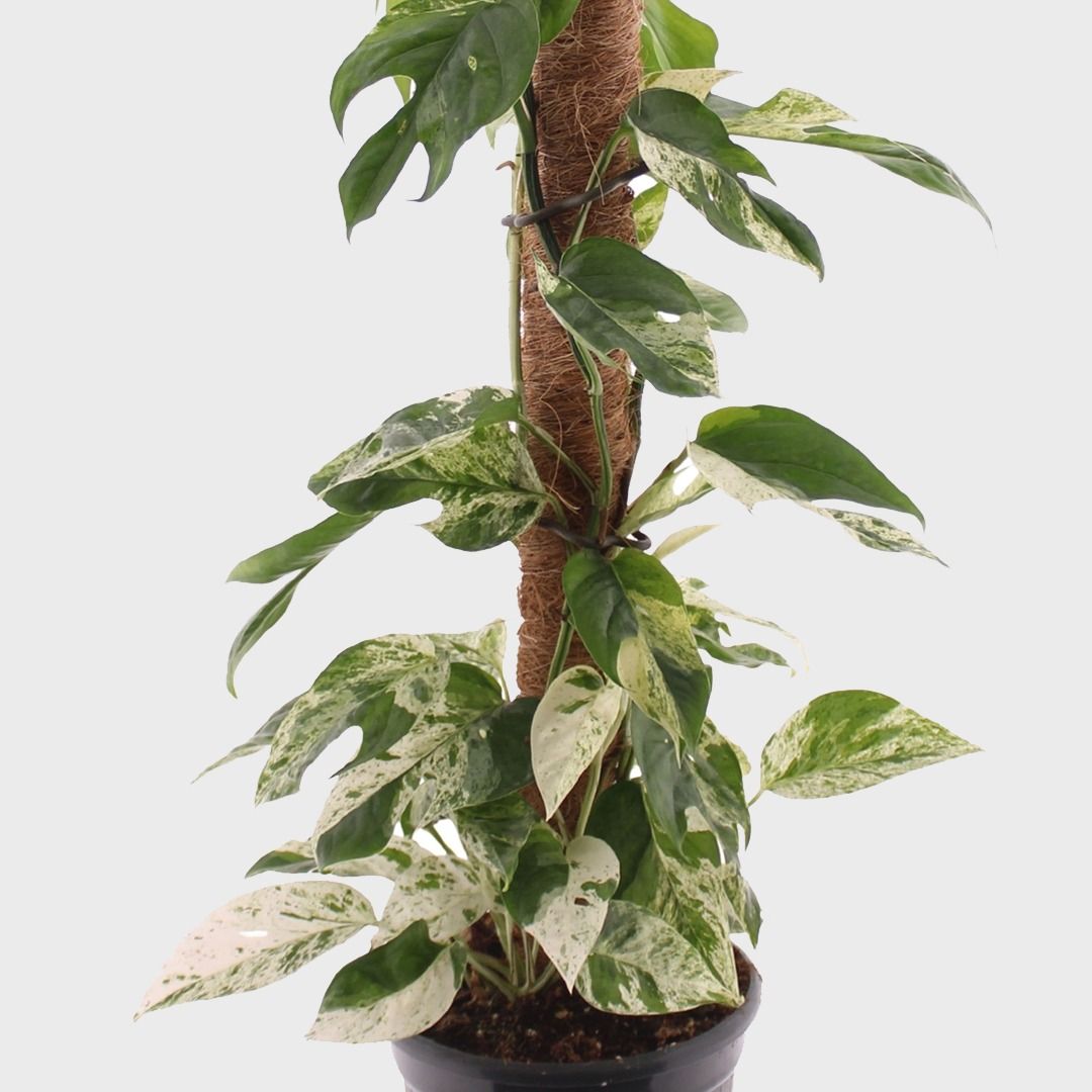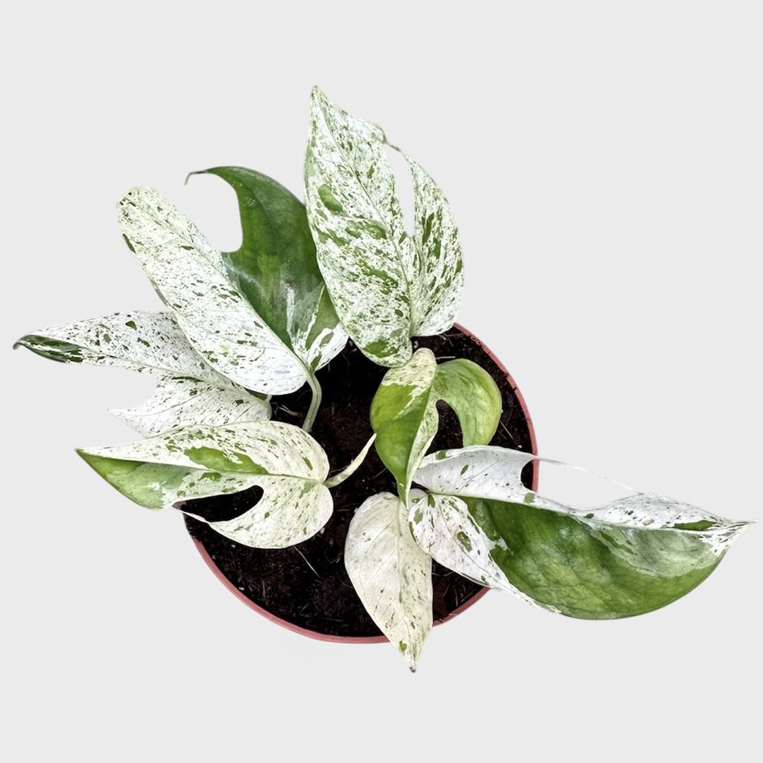 De Epipremnum Pinnatum Marble Variegata is een opvallende klimplant met gemarmerde bladeren die variëren van lichtgroen tot roomwit. Sommige bladeren kunnen al gaten vertonen, terwijl andere dat nog niet doen. Geen zorgen: na verloop van tijd verschijnen de kenmerkende insnijdingen vanzelf.